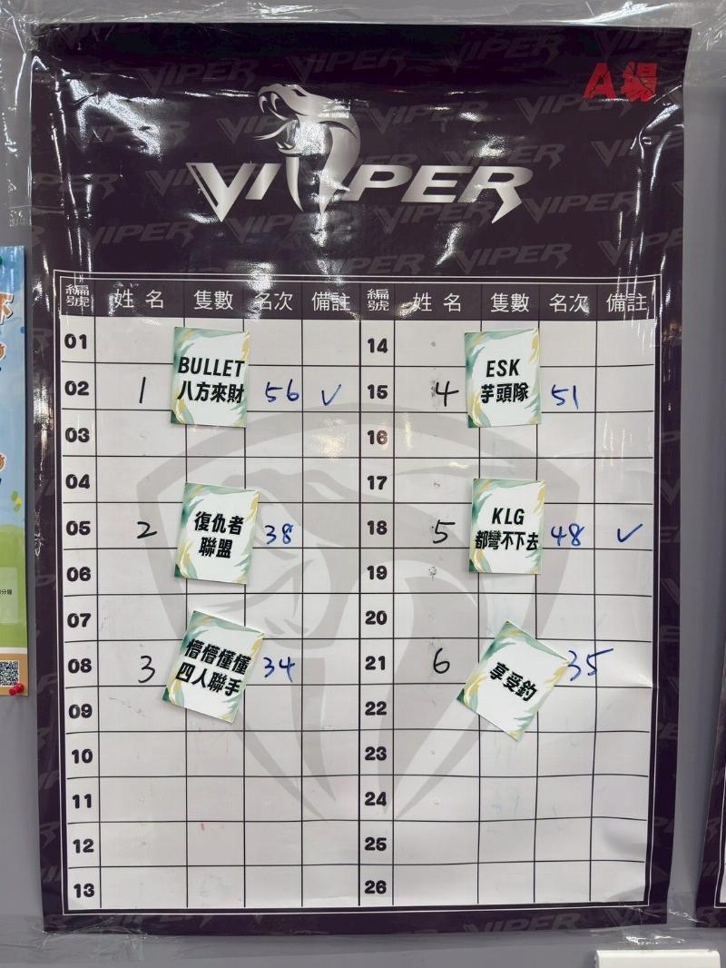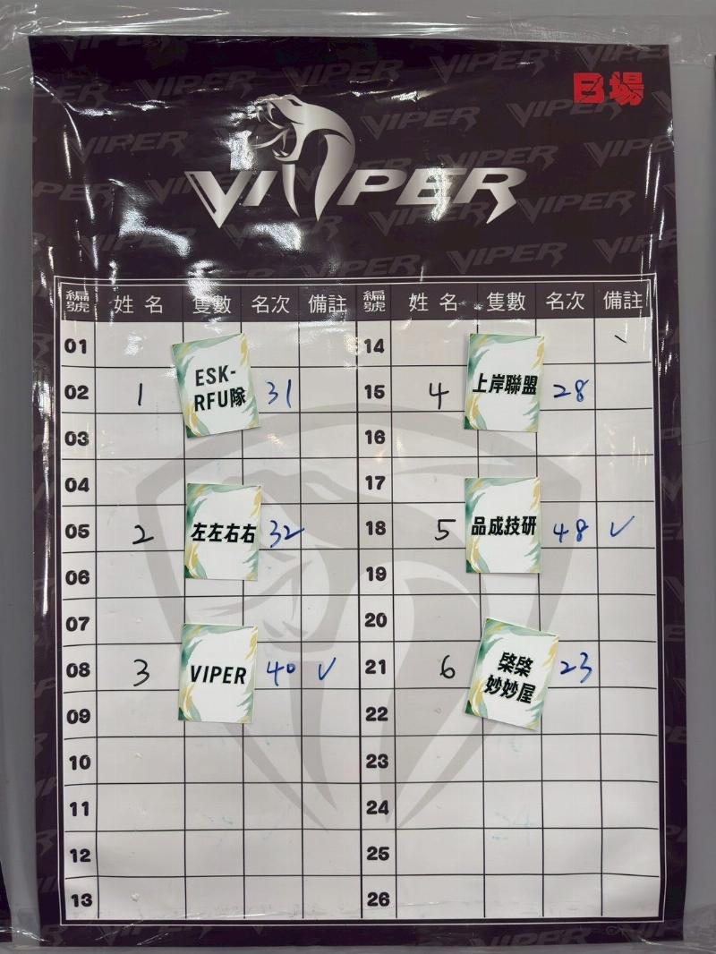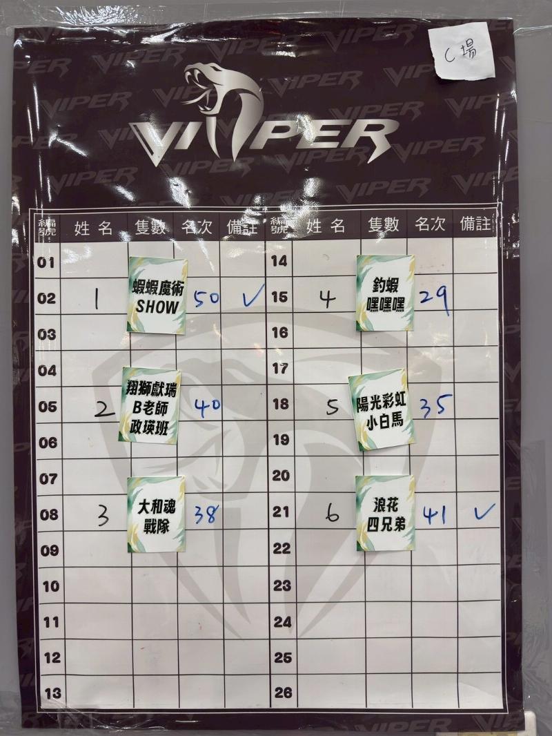 🌟比賽方式 : 四人同時下場,預賽三場,決賽一場,預賽以對抗賽,對面的選手即是你的對手,打贏對面隊伍後,勝方三隊再以隻數取前2隊進決賽,決賽分上半場及下半場各25分鐘中場換邊坐釣,以總隻數排名,取前四名。